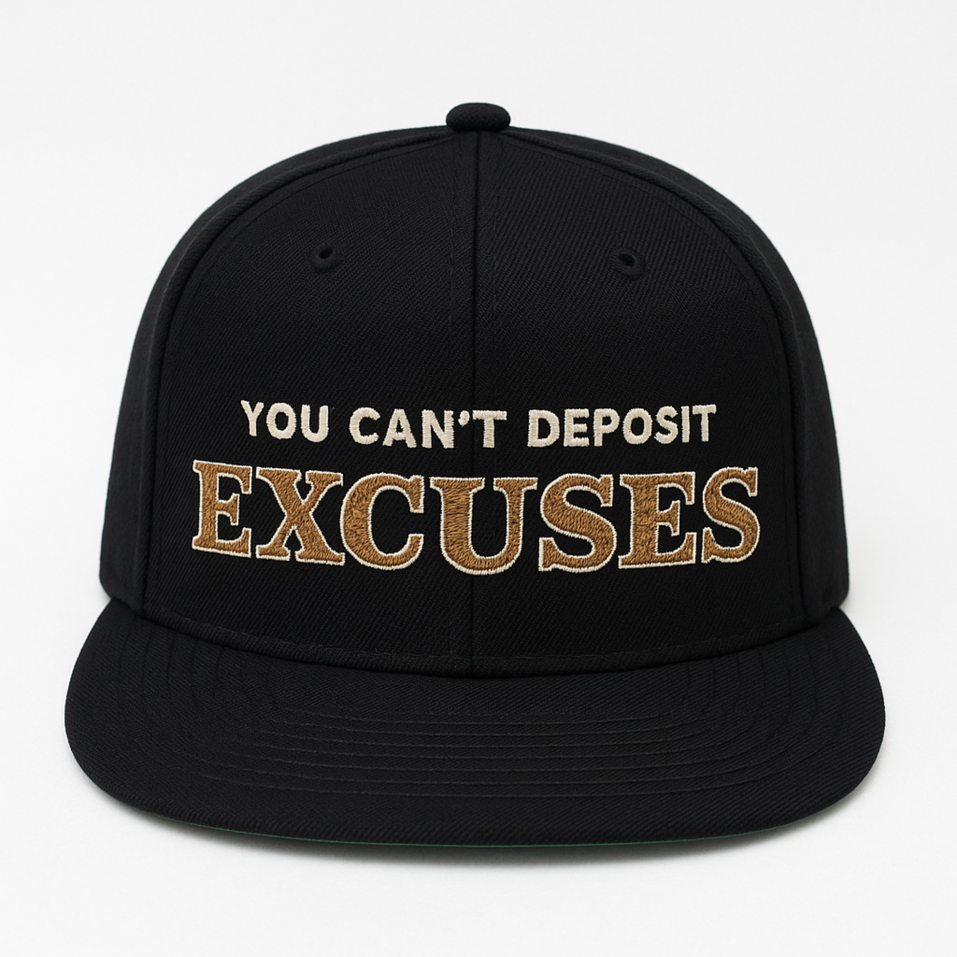 - Embroidered “YOU CAN’T DEPOSIT EXCUSES” in bold lettering
